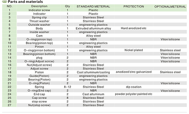 SAT系列氣動執行器以SR系列氣動執行機構為例在彈簧復位的應用中,輸出力矩是在兩個不同的操作過程中所得,根據行程位置,每一次操作產生兩個不同的力矩值。彈簧復位執行機構的輸出力矩由力(空氣壓力或彈簧作用力)乘上力臂所得第一種狀況:輸出力矩是由空氣壓力進入中腔壓縮彈簧后所得,稱為"空氣行程輸出力矩"在這種情況下,氣源壓力迫使活塞從0度轉向90度位置,由于彈簧壓縮產生反作用力,力矩從起點時最大值逐漸遞減直至到第二種狀況:輸出力矩是當中腔失氣時彈簧恢復力作用在活塞上所得,稱為"彈簧行程輸出力矩"在這種情況下,由于彈簧的伸長,輸出力矩從90度逐漸遞減直0度如以上所述,單作用執行機構是根據在兩種狀況下產生一個平衡力矩的基礎上設計而成的。如圖11所示。在每種情況下,通過改變每邊彈簧數量和氣源壓力的關系(如每邊2根彈簧和5.5巴氣源或反之),有可能獲得不平衡力矩 在彈簧復位應用中可獲得兩種狀況:失氣開啟或失氣關閉。在正常工作條件下,彈簧復位執行機構的推薦安全系數為25-50%